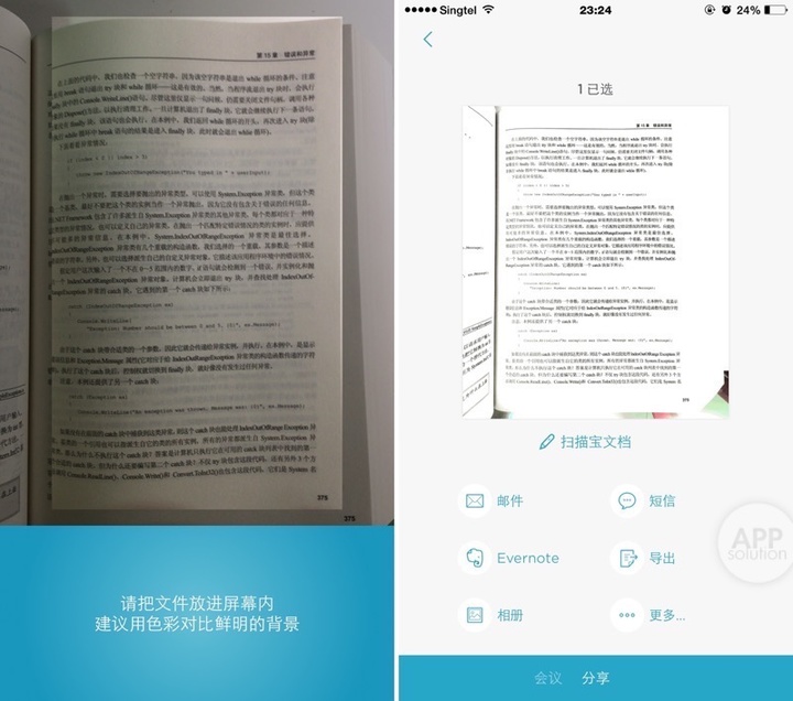 扫描宝无疑是这四个软件中最便捷的一个,官方号称最快的扫描软件果然名不虚传,打开软件直接启动相机开始扫描。由于印象笔记自家的图像识别技术,相机可以自动识别你拍的是文档还是图片,识别后再按该种类情况导出相应地文件格式,如果你已绑定了印象笔记账号,默认自动上传印象笔记,也就是说从打开手机到文件扫描完成到上传全部都是自动的,而且期间软件的反应速度非常快。