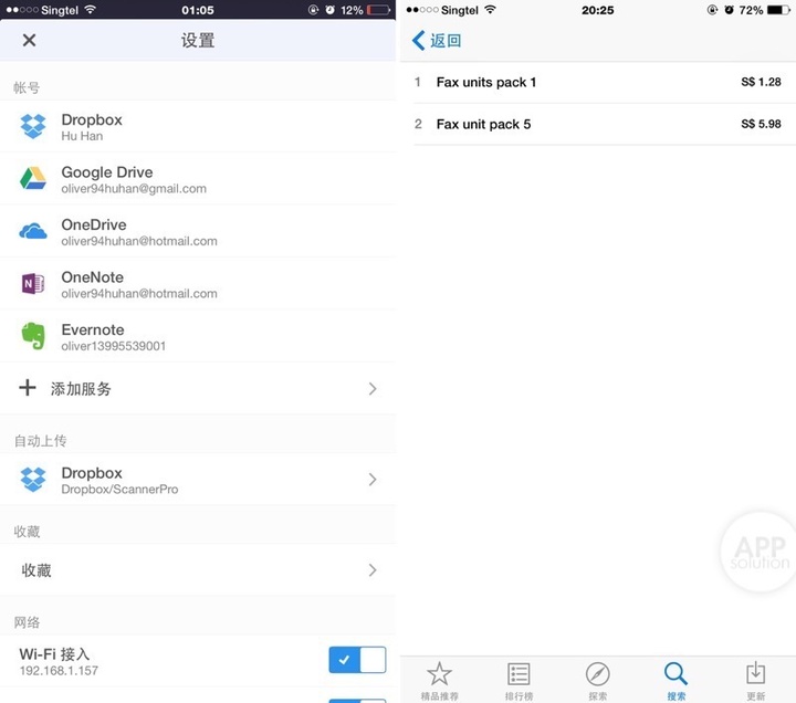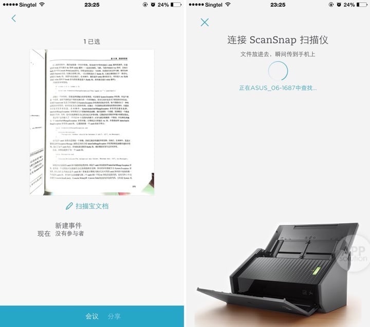 不过扫描宝还有一个很特别的功能,相当于一个扫描仪客户端,当然此功能只支持音箱笔记自家的 ScanSnap 扫描仪,当两个设备连接在同一 WiFi 网络下之后,扫描仪扫描后的文件可直接导入扫描宝进行编辑和分享。(当然我绝不会说这个扫描仪就要花 ¥3998 呢。)