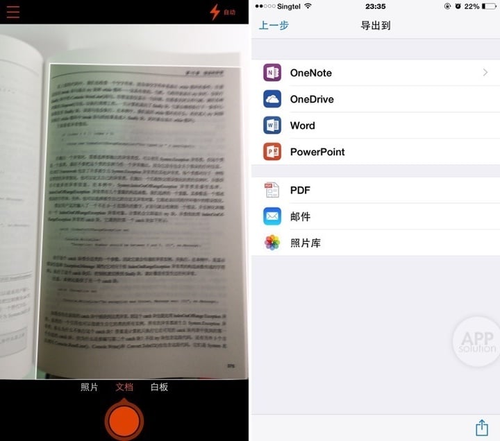 Office Lens 在便捷程度上仅次于扫描宝,也是一打开软件就是相机页面,但少了图像自动识别技术,Office Lens 在扫描前你首先要选择你扫描的文件类型,扫描后除了导出到 PDF,再就是各种微软办公软件了,除了导出过程因为会连接 OneDrive 服务所以会有明显延迟,比扫描宝稍微慢一点。